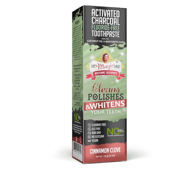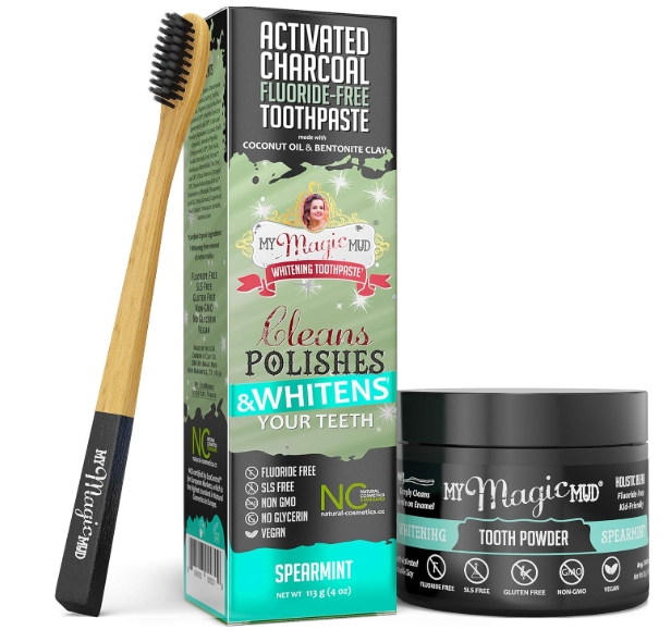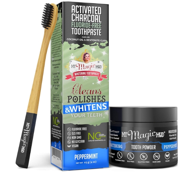 My Magic Mud toothpastes and other products contain activated charcoal, which adsorbs stains and leaves teeth whiter. The charcoal binds to compounds that discolor teeth from coffee, wine, smoking, and more. It’s a gentle but highly effective stain remover.